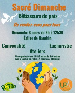 Le dimanche 8 mars de 9h à 12h30 à l’église de Nandrin : « Sacré Dimanche » : Bâtisseurs de paix