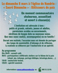 Le dimanche 8 mars de 9h à 12h30 à l’église de Nandrin : « Sacré Dimanche » : Bâtisseurs de paix